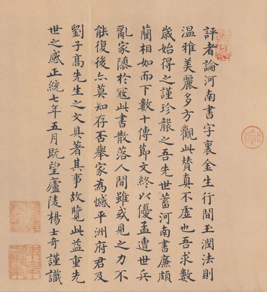 这件墨迹与褚书碑版相比,风格是一致的。其用笔富于变化,气均力匀;在处处表现运锋着实的同时,也往往参用轻盈飘洒、灵活自然的笔墨。起笔轻捷,收笔沉着,主要笔画适当地伸展,给人以笔势翩翩、萧洒大方、平和闲雅、神爽超迈的感觉。 王世贞评褚书曰:“一勾一捺有千钧之力,虽外拓取姿,而中擪有法。”由墨迹观之,尤为明显。书风或学钟繇之体而古雅,或师逸少之法而瘦劲。无怪苏轼说:“清远萧洒,微杂隶体。” 卷后有赵孟坚、邓文原、柳贯、杨士奇、钱溥等人跋记。赵孟坚跋称:“容夷婉畅,如得道之士,世尘不能一毫婴之。” 胡广说:“观《倪宽赞》笔势翩翩,神爽超越,大胜家侄帖诸刻,诚可为希世之玩也。” 吴宽说:“书家谓作真字能寓篆隶法则高古,今观褚公所书《倪宽赞》益信。” 明詹景风《玄览编》:“燥而不润乏天趣,笔似清劲而实单弱。” 明张丑《清河书画舫》:“褚河南《倪宽赞》是宋世临本,后有赵子固等七跋却真。”